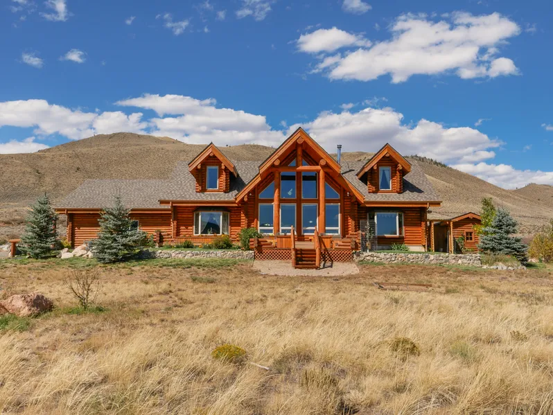 This breathtaking full-log home is perched on an elevated site, offering panoramic views of the Laramie River valley and Jelm Mountain. Nestled among rolling hills, it showcases a classic log cabin design with a striking entrance and soaring glass wall framed by rich, golden timber beams. Perfect for those seeking a sanctuary surrounded by nature, this exclusive property provides direct private access to BLM and Med Bow National Forest.