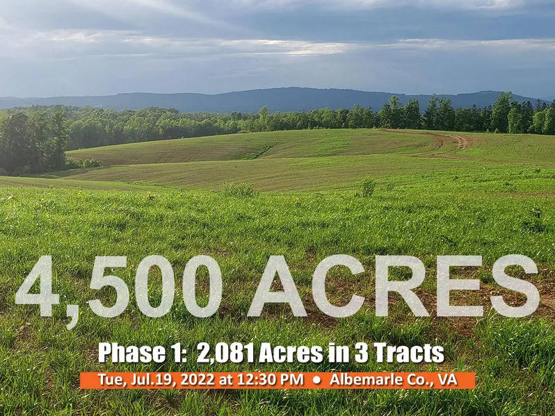 Incredible opportunity near some of Virginia's most exclusive properties including UVA's Morven, James Monroe's Highland, Thomas Jefferson's Monticello (a National Historic Landmark and UNESCO World Heritage Site). An impressive 4,500 acre holding in Albemarle County is being sold in two phases providing a once-in-a-lifetime blank slate opportunity to create your exclusive private estate, premier farm / ranch, equestrian property, timber holding, hunting camp, conservation, or investment. In July of 2019, the property was placed in a conservation easement adding to Albemarle County's growing list of protected lands (over 108,869 acres at the end of 2020). Property lays very well with long frontage and multiple access points from 4 roads and features approximately 18.3 miles of frontage along numerous creeks and streams including Jacobs Creek and Buck Island Creek.