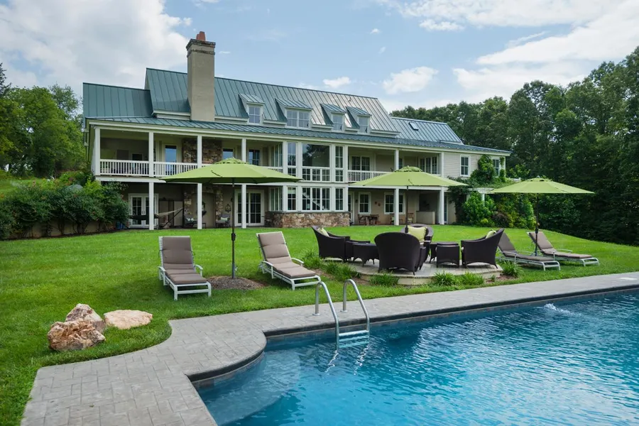Quintessential Albemarle estate on Rivanna River. Bucolic rolling countryside, incredible Blue Ridge views, captured in a modern provincial residence designed by renowned DGP Architects. Premier craftsmanship, materialsreclaimed beams, heart pine, grand native stonework. Thoughtfully blended kitchen, great rm, dining areas are the heart of the home while 5 beds with ensuite baths allow for space to spread out across generous 7068 sqft. Warm, open interior, abundant light, easy flow to spectacular outdoor spaces: outdoor fireplace, multiple porches, magnificent pool with mountain views. The charming property also includes an attached 2 bed, 2 bath guest/office wing, sauna, steam room, pastures, woods, trails, stream and1840s cabin.
