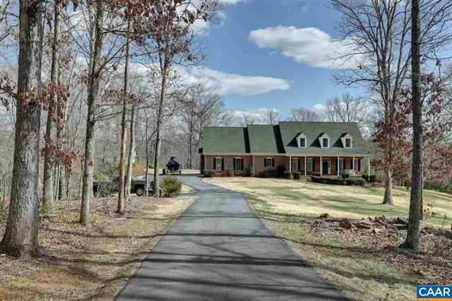 Ultimate privacy and seclusion on 25 acres in southern Albemarle Co. A paved driveway winds through mature hardwood forest to a one-owner custom brick home built in 2002, set amongst large oak trees. The well-maintained home is 3500 square feet and features hardwood floors and 10 ft ceilings on main level, first floor master with nicely updated bathroom including tile shower, country kitchen with cherry cabinets, SS appliances, and a cheery breakfast nook overlooking the rear yard. Large living room with corner gas fireplace. Upstairs there are 3 bedrooms, 2 baths, and a sitting room. House sits high above Green Creek with 2000 ft of frontage. Close to Rockfish and James Rivers. DSL internet, front and rear porches, two storage sheds