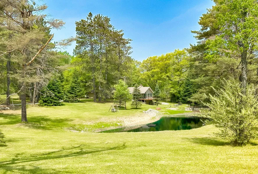 This year-round home sits on a beautiful secluded 60 acres. Features 2 ponds, a fenced in garden, trails, shooting lane, deer blinds and more. Beautiful mix of mature pine, maple, oak and cedar trees. Enter the home off the covered porch into the 22x13 living room with a brick wood burning fireplace. 14x13 kitchen has plenty of cupboards and recessed lighting. Spacious 25x9 dining room is surrounded by windows and sliding glass doors. Allowing access to the front wrap around deck that overlooks 1 of the ponds. Just off the living room you'll spot the 2 main floor bedrooms and 1 bath. The first bedroom is 13x12, with carpet flooring. The second bedroom is 11x11. The 8x6 full bath has ceramic tile flooring. In the full walkout basement you have a 26x13 family room with a brick fireplace and bar. 14x11 laundry and mechanical room. 10x25 craft room gives you easy outdoor access. 10x12 bonus room could be used as an office or extra storage space. The third bedroom is 11x12. Updated 6x7 bathroom has a walk-in shower and laminate flooring. Detached 24x24 garage has a 12x24 enclosed lean-to off the back. 40x24 Pole barn has concrete floor and electric. Implements in the pole barn available for separate sale.