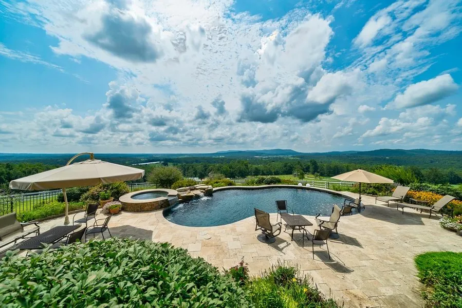 Stunning 47+ acre equestrian estate w/rolling pastures and hardwood forest. Custom home overlooking pastures w/sweeping majestic mountain views. Walk-out basement, and extras throughout. Great room w/towering ceilings, cedar beams, floor-to-ceiling stone fireplace. Chef's kitchen w/center island, wine cooler, walk-in pantry, custom cabinets, granite countertops/stone backsplash, stainless steel appliances. Main level master w/large walk-in closet & built-in cabinetry. Master bath features marble floor & claw foot tub. 2 ensuite guest bedrooms. Covered deck overlooking pool w/hot tub & boulder waterfall; extensive landscaping. 5-stall Morton barn w/sliding end doors & paver aisleway. Separate septic & generator. Fly system, hay loft, wash stall and large equipment overhang. Tack room w/half-bath. 4 12 x 12 stalls and foaling stall w/mats, heated auto waterers. 80 x 168 arena w/excellent f...