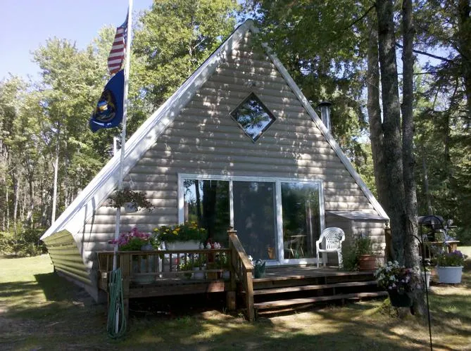 This nice "A" frame is located on 275 acre all-sports Nevins Lake. It features a big pole barn along with a wood heated detached 2 car garagewith a workshop attached. Many extras including a 1997 Ski-Doo snowmobile, Hydralic log splitter, Lawn watering pump and more.