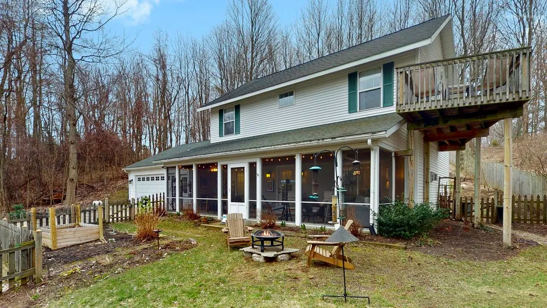 Nestled among rolling vineyards and orchards on over half an acre of land overlooking Hutchins Lake. Step into the screened porch before entering the living area with open floor plan with new wood flooring. The updated chef's kitchen includes stainless steel appliances and a large butcher block island. 3 large bedrooms with cathedral ceilings and 2 full baths for family and friends. The 2nd story primary bedroom has a private balcony with views of the lake. Beautiful landscaping and a patio overlooking the woods in a private inviting setting. Add to this, an oversized attached 2 car garage. This could be a great vacation rental! Plus high-speed internet access for remote workers. Located near the Lake Michigan beach communities of Fennville, Saugatuck, Douglas. Nearby public lake access.