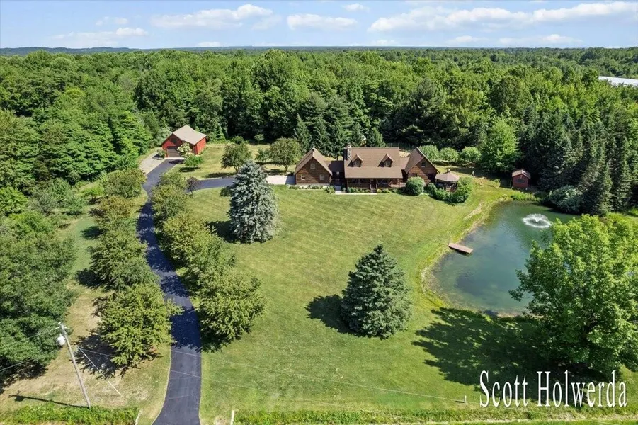 Welcome to this stunning log sided estate nestled on 6.8 picturesque acres in Holland's desirable Laketown Township. This property offers a true resort-style living experience, complete with a serene 1/2-acre pond, manicured lawns, flourishing fruit trees, a fenced garden with berry bushes, and peaceful, wildlife-filled woods. Step inside to discover a spectacular interior featuring a dramatic floor-to-ceiling stone fireplace, a kitchen designed to impress, and a spacious primary bedroom suite with a walk-in closet, ensuite bathroom, and a private loft sitting area. The main floor also offers two additional bedrooms - one currently used as an office - and a full bathroom. Upstairs, a charming balcony overlooks the living room and leads to another full bathroom and a fourth bedroom. Lovingly maintained and thoughtfully updated in recent years, the home boasts numerous enhancements both inside and out. Notable updates include dual furnaces and air conditioning units - 2022, wood flooring and carpeting - 2024, all appliances - 2022, finished basement - 2024, a theater room in the finished basement - 2024, underground sprinkler system - 2024/25, insulated and heated the outbuilding - 2022 (comprehensive update list included with the listing). This remarkable estate is truly a must-see to fully appreciate its beauty and charm. Schedule your private showing and experience the luxury and tranquility this property has to offer.