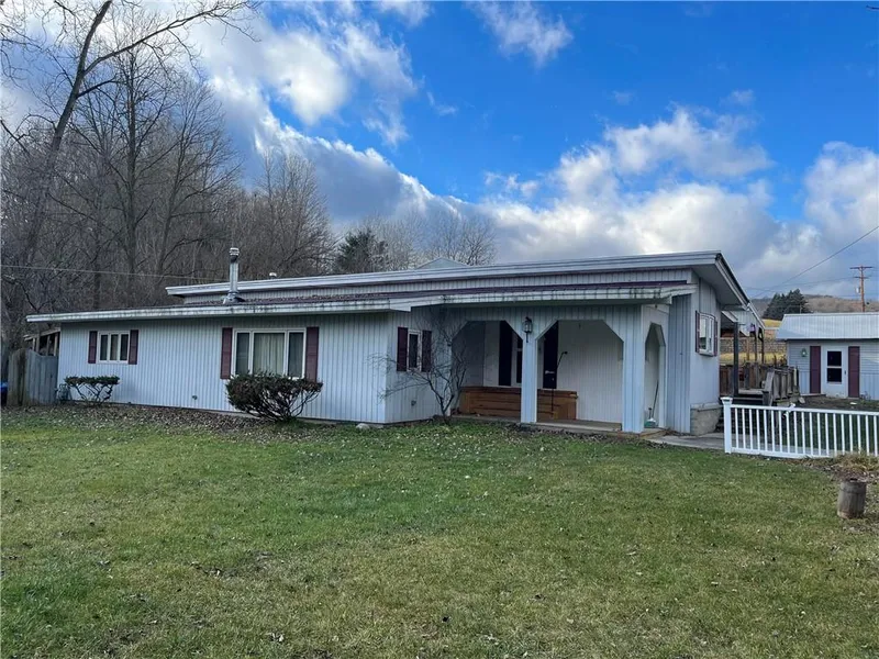 This is a must-see manufactured home! This manufactured home has 3 additions. Enter the home from the side door to a nice sunroom that looks over the backyard. There is a ductless air and heat unit in the sunroom which makes the space cozy to visit or just hang out and watch TV. There are also 2 forced air heating systems to heat separate parts of the house. Off the sitting room, you will find a bedroom, kitchen, and dining area. The eat-in kitchen has been remodeled with beautiful Formica countertops, oak cabinets, and an island that includes gas-fed burners to cook. Down the hallway, you will find a full bathroom, hall closet, washer and dryer, and a large primary bedroom with a full bathroom. Walking down from the dining area you will find the large living room with wood wood-burning fireplace. From the living room, enter to the large 3rd bedroom. Outside you will find a covered outdoor deck/pavilion and a large workshop. Located between Hornell and Alfred you have multiple options to shop, and are less than 10 minutes away from Alfred State College and Alfred University. Tax records indicate square footage as 696, however, with additions, there is close to 2,000 sf of living space.