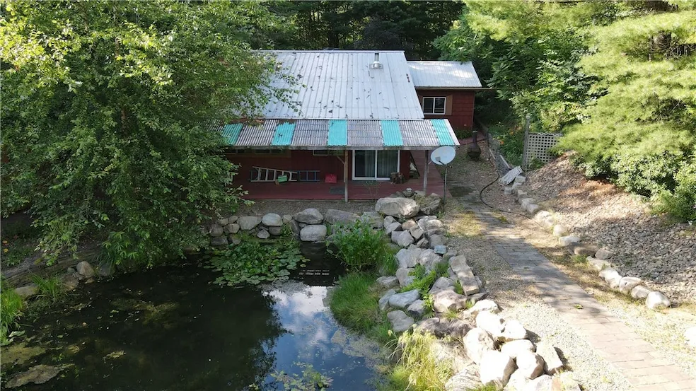We are pleased to offer this beautiful cabin and workshops nestled in the hills of Portville, NY. This unique 1 bedroom, 1 bathroom cabin features beautiful craftsmanship both inside and out. Heated by a wood burning stove, enjoy the spacious living areas and modern kitchen area with all of the comforts of home. The unique design of this house features loads of details such as the tongue and groove work and stone on the kitchen island, speaking to the craftsmanship and thought put into this cabin. Sit on the front deck and enjoy overlooking a 90x40 pond and garden area. A rear outbuilding off from this deck serves as additional indoor space with attached chicken coop. Also featured are 2 additional workshops and garage for a total of 3 parking spaces. The main workshop not only has an insulated shop, but a second level. This upstairs area features additional living space with wood burning stove trimmed in barnwood and tongue and groove. This bonus space would be perfect for visiting guests or as an office area off from the main house. There is so much here to see and explore. Let your imagination transform this unique property into your next residence or getaway.