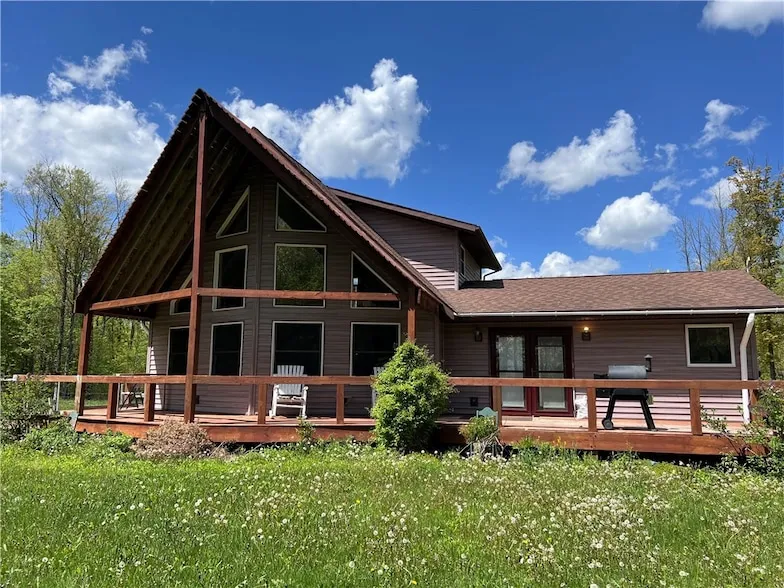 Secluded at the far end of quiet Blakley Road, nearly forty-six wooded acres open unexpectedly onto a cedar-trimmed chalet that looks borrowed from the Adirondacks. Step from the gravel drive onto a broad wrap-around deck and the first pond glimmers through the trees; inside, a soaring wall of glass turns those same trees into living art. The main level blends an open great room and warm pine kitchen with two comfortable bedrooms and a full bath. Upstairs, a vaulted loft serves as a private primary suite with its own bath and treetop view. Radiant lines beneath every room keep 1,728 square feet toasty; an outdoor furnace handles the heavy lifting, backed by on-demand heat for effortless peace of mind. Life here naturally flows outdoors a second spring-fed pond waits a short stroll away, songbirds thread through stands of maple and cherry, and starlight goes unchallenged by city glow. A three-bay pole barn stands ready for vehicles, projects, or the workshop you ve always pictured, while an extra shed hints at gardening or hens. The home is perfectly comfortable today yet invites your finishing touch, a rare opportunity to craft value on acreage that s increasingly hard to find. Five minutes to Swain Resort s lifts, about an hour to Rochester or the Southtowns of Buffalo, and mere seconds to complete quiet: 10255 Blakley Road is where weekend dreams become everyday life. Come see how easy it is to arrive and how hard it will be to leave. Please do not walk the property without permission. Agent must be present at all showings.