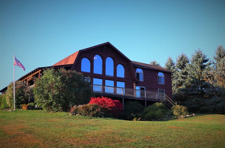 Just minutes from town this property has been lovingly enjoyed as a horse farm with cattle, perched on a crowned pasture with 360 degree views that are breathtaking. Nowhere in our view in any direction can you see a town, an airport, a windmill, another house or cell tower. You could be convinced that you are the first and only person this land was made for. The canvas of fall color amazed us during our photo shoot and would be a season to look forward to every year. In fact weddings have been hosted on the property in the high pasture due to the views. Hardwoods and rolling hills compliment the high pasture on the edges of the property, providing an opportunity to hike, hunt and enjoy wildlife at your door step. The woods are obviously well populated with wild turkey, deer and an occasional bear strolls through a woods that reminds us of Sherwood Forest. The virtually private road gently approaches a barn and silo with stables, while a little further up the drive way a magnificent custom built log home with full basement is warm and waiting for you to enjoy. A covered country porch that wraps two sides of the cabin is the perfect place for a breezy summer iced tea, or a rocking chair and a cup of coffee each morning to start your day. The log home looks over much of the property and has large picture windows on the north face to continue to enjoy the snowy days of winter views come the snowfall months while you are warm and cozy inside. Heavy caber beam construction, and an all wood interior blend the modern conveniences to a rustic family décor. A loft over the kitchen leads to the upper bedroom suites, while the main level has a bedroom, bathroom and an additional complete in law suite for guests or just another large living space separate from the core home. An open concept and expansive kitchen and dining room is inviting to all family members where large gatherings and holiday event would certainly be a center point of owning this beautiful log home. The barn is home to the horses and cattle, with stables, a tach room, wash room and hay loft. Only once in a while does a property come by that has so much charm, vista views that second to none and a full country living experience that would be described as “it has it all”.