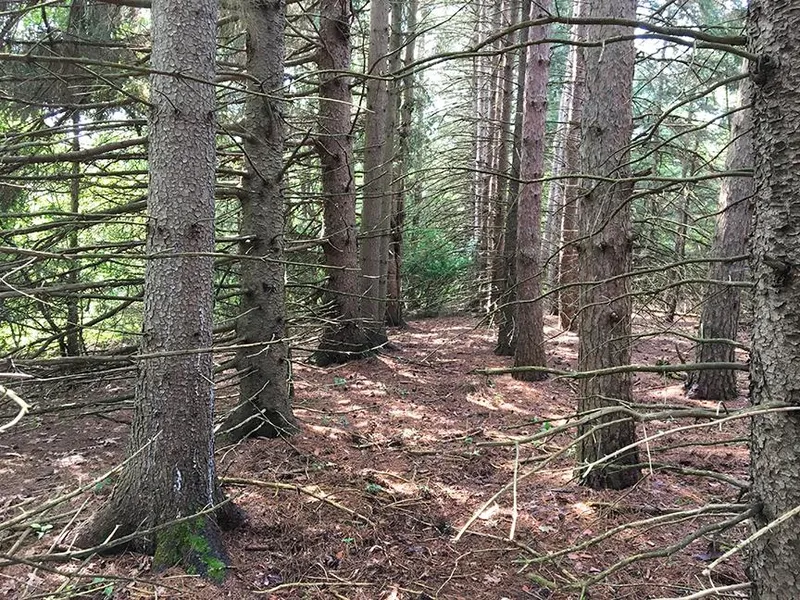 Majority of the woods are pine trees that were planted years ago by the seller. Includes some hardwoods. Trails throughout the property.