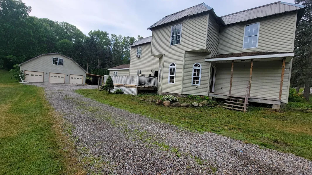This large home is on approximately 1.5 acres, just minutes from Alfred, NY. Accompanied with an insulated detached three-bay garage, there is plenty of room for you and your family or to utilize as a potential investment for a rental to college students. The current seller has ensured plenty of improvements and renovations to the home for a modern feel. Enjoy the lower level with several entry rooms, a large kitchen, large dining room, bathroom, laundry room, utility room, office, and living room. Walk out of the kitchen onto the porch that consists of composite material for longevity. The layout of this home includes four bedrooms and one finished bathroom with a room upstairs that is unfinished that could provide a second full bathroom with drain lines already in place. The flooring includes a mixture of carpeting, vinyl, and hardwood. The yard allows plenty of room for recreational use and includes a storage shed out back of the garage. The house and garage both have separate 200 amp electric service. Some appliances will convey with the property. We look forward to showing you this home!