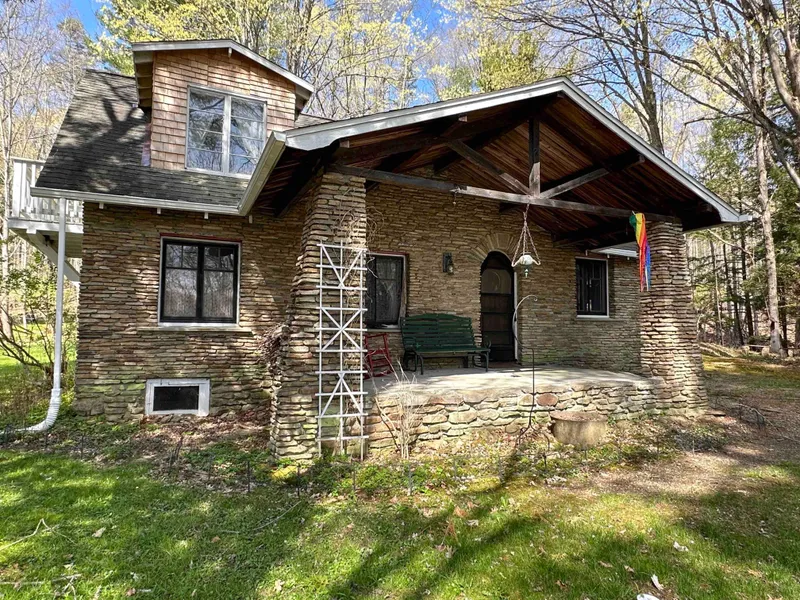 Take the tree lined driveway to this charming lakefront cottage. The stonework on the covered front porch compliments the interior of the cottage. The living and dining area have exposed hand-hewn wood beams, and a cozy stone fireplace with a wood stove insert. The kitchen is located at the back of the cottage and has access to the backyard. Two bedrooms and a full bathroom are located on the first floor. Take the staircase up to the third bedroom which has a private balcony.