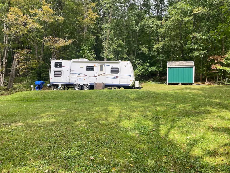 The property includes a travel trailer complete with a full bathroom, a master bedroom, and a bunk bed area. The travel trailer is being sold as-is. Electric, well and septic are available. There is ample yard space for family and kids to enjoy, meticulously mowed and cared for. A recently constructed storage garage with electricity is available, complete with an additional electrical receptacle for RV or travel trailer use. This property offers an excellent opportunity for building a house or camp.