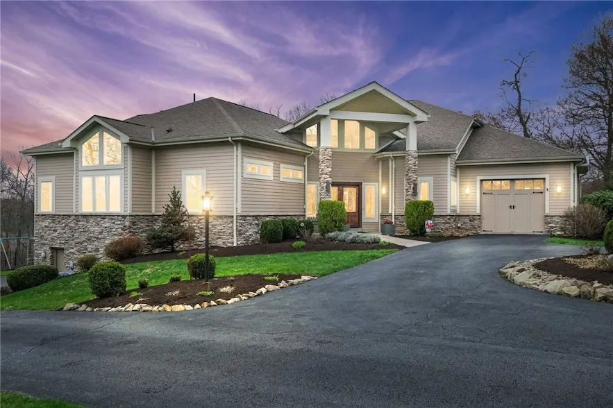This remarkable property boasts a stunning floor plan designed for seamless living. The main level begins with a grand 2 story foyer and includes radiant heated floors an expansive Great Room with soaring ceilings, a stone two-sided gas fireplace, and a wall of windows. The spacious chef s kitchen, is equipped with top-of-the-line appliances, custom cabinetry, and a large island. The first-floor Owner s Suite is a private sanctuary with a luxurious bath that includes a marble shower, soaking tub, a large walk-in closet and private office. Upstairs, the home offers 3 bedrooms and 2 full bathrooms and a flex space. The lower level include a wet bar, a two-sided stone gas fireplace, two workout areas, a full bath, and radiant heated floors. Off the main floor is an expansive deck with vaulted ceilings over half the space that offers a perfect vantage point to take in the private, wooded 4.2-acre lot. Below, the walkout lower level opens to a covered flagstone patio and fire pit.