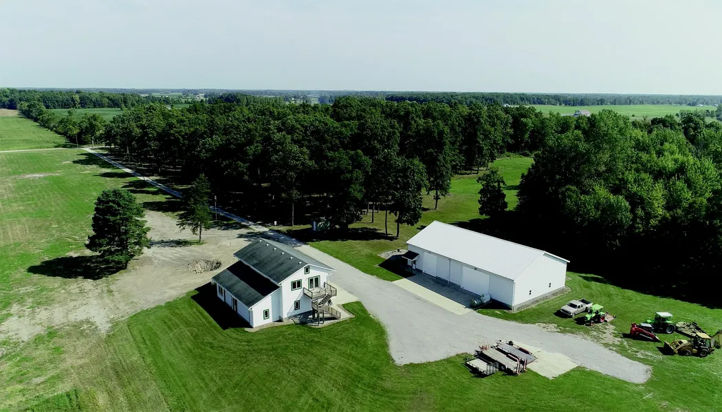 Tract 3: 7.5 ac WITH LARGE TWO STORY STUDIO/GARAGE UNIT PLUS A FINISHED, HEATED & COOLED 4500 SQUARE FOOT METAL BUILDING! The Studio/Garage building has 1-2 bedrooms, full kitchen and living room over the garage area. There is also a walk out deck off of the upper level to view the surrounding farm fields and woods. The lower garage area has four car finished and heated garage, plus bump out 2 car finished garage off of the back. The metal building features a completely finished interior with heating and air. There is a first bay, 18 ft.x36 ft. with 10 ft.wx14 ft.h overhead door. There is a 7 foot heat controlled drive thru to second bay which is 36 ft.x40 ft.. There is a 14 ft.hx18 ft.w overhead door. Both bays have a full length 8 ft. balcony for additional storage. There is 220 electric service plus water and bathroom. This tract would make a fantastic home based business location!