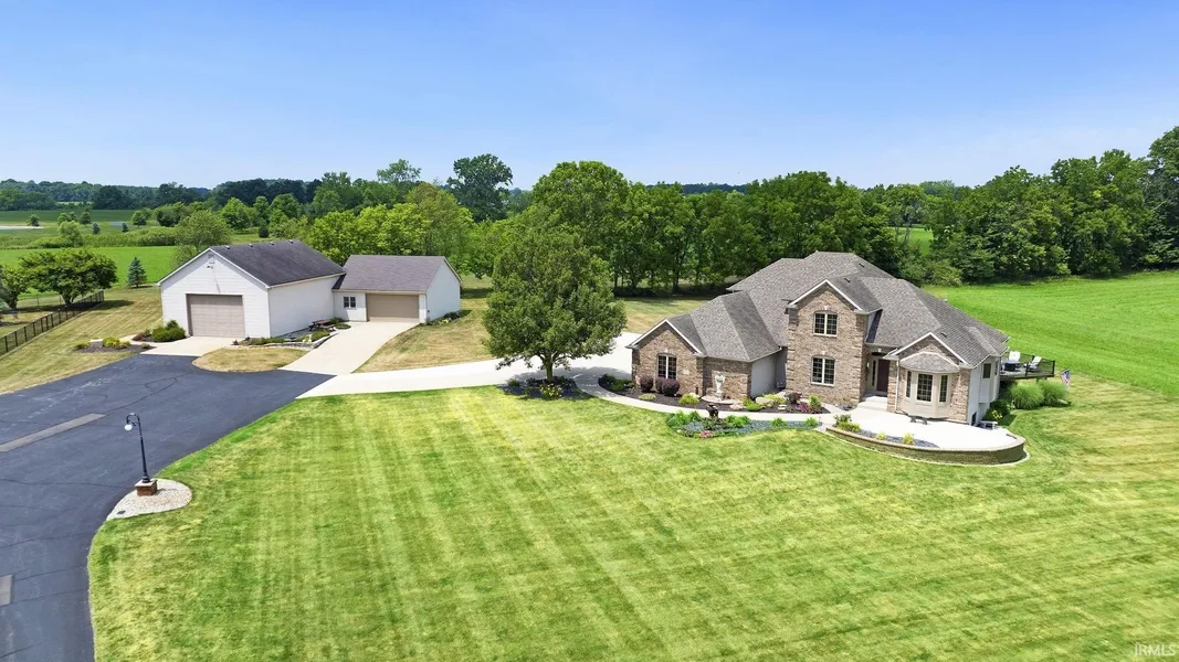 OPEN HOUSE FRIDAY 10/17 FROM 5-7PM! This beautifully crafted custom home by Bob Buescher sits on two parcels totaling 3.28 acres, offering a peaceful country setting just minutes from downtown Leo. Outdoor enthusiasts and hobbyists will love the 3 connected outbuildings. One is fully climate-controlled with a professional-grade air compressor, while the others offer ample storage. Inside, artisan woodwork shines throughout the open layout, with custom doors, cabinetry, and trim. The gourmet kitchen features premium Grabill Cabinets and offers a stunning view of the backyard. Enjoy entertaining or relaxing on one of two decks. One off the kitchen and another accessible from the main-level primary ensuite. A formal dining room and den provide flexible living spaces, while upstairs you'll find three bedrooms and a full bath. The daylight basement is a true highlight, featuring a full second kitchen, spacious rec room, and dedicated theatre room. It also includes a well-designed workshop area and private stairway to the garage, adding to its versatility. A custom front patio with steps to the lower level completes the picture. Immaculately maintained, this home blends luxury, comfort, and functionality in a peaceful yet convenient location. HVAC new in 2021. Don’t miss your chance to call this one home!