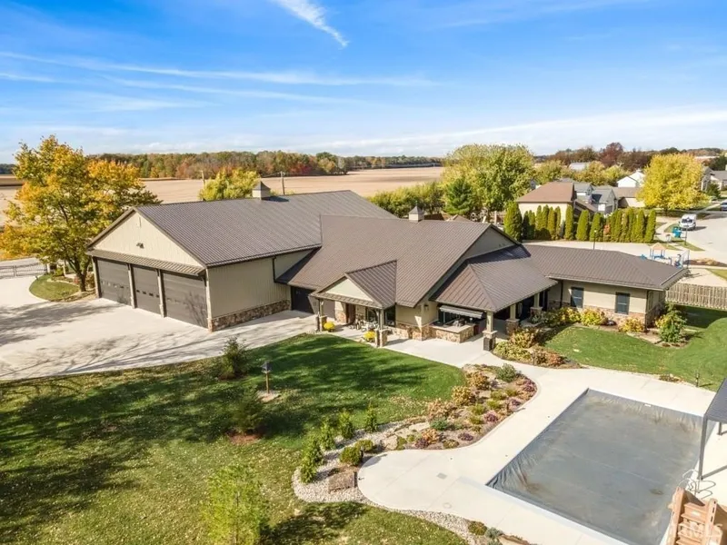 Luxury Barndominium on 2 Acres with Commercial-Grade Pole Barn. Completed just four years ago, this exceptional barndominium sits on a 2-acre lot with city water and sewer, offering 2,500 sq ft of upscale living space paired with an impressive 11,000 sq ft fully finished pole barn. A rare blend of luxury living, expansive functional space, and outstanding business or hobby potential. The pole barn features 16-foot ceilings, three 14-foot exterior doors, a 10,000-lb two-post car lift, and over 2,700 sq ft of polished concrete floors—ideal for automotive enthusiasts, contractors, collectors, or commercial use. Approximately 2,400 sq ft currently carries a light commercial variance with signage; a new owner must reapply through Allen County to continue commercial use. Additional features include a second-story man cave overlooking the shop, a finished half bath, washer and dryer, a dedicated mechanical room with built-in air compressor and plumbed air drops, and 400-amp electrical service. Both the home and barn are constructed with 2×6 walls, high/low-density spray foam insulation, and radiant floor heating powered by a shared high-efficiency two-zone boiler system. This system also provides on-demand domestic hot water with a recirculation line for near-instant hot water throughout the property. The home offers 10-foot ceilings, solid surface flooring, premium countertops, and high-end appliances. Comfort is enhanced by a two-zone Carrier AC system and Aprilaire steam humidifier. Additional highlights include a natural gas fireplace, 8-foot Andersen 400 Series windows and doors, remote-controlled blinds, and automated Lutron lighting. The gourmet kitchen features a large granite island, premium appliances, and a pot filler. The home includes three bedrooms and two full baths, including a primary suite with a walk-in tiled shower. Outdoor living shines with a large covered porch, built-in gas grill, and custom concrete countertop. The backyard retreat includes a heated 18’ x 36’ in-ground concrete pool with tanning ledge, slide, water features, and automated safety cover. Additional features include whole-property Wi-Fi, two automated gated driveways, a 32+ zone security system, and a fully climate-controlled barn. This one-of-a-kind property must be seen to truly appreciate its scale, craftsmanship, and possibilities.