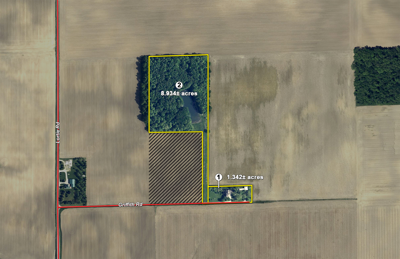 Tract 2: 8.9± ac of wooded recreational land with a pond (depth of pond and fish species, if any, unknown). Includes an owned 50' lane off Griffith Rd. back to the woods and pond. The Johnson Branch #2 drain runs through the Northeast portion of this tract with a 75' statutory drainage right-of-entry on both sides of the drain. This tract offers excellent building site potential with a superior secluded location and maximum privacy (no soil testing has been done). The tract offers an abundance of dense mature trees with possible timber value. 2024 payable 2025 taxes are $103.08.