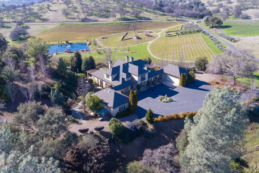 Step out of this 3,800 square foot Country French home to a wine country sunset overlooking a swimming pond surrounded by 10 acres of terraced, award winning grapes, a 90 tree olive orchard lined by rock wall ruins from the 1800's. This property is ideal for entertaining in the large great room that opens up to an outdoor fireplace and 600 bottle wine cave, or down at the pond under the pavilion. Just 2 miles from Shenandoah Valley wine region. (tasting, restaurants & shopping)