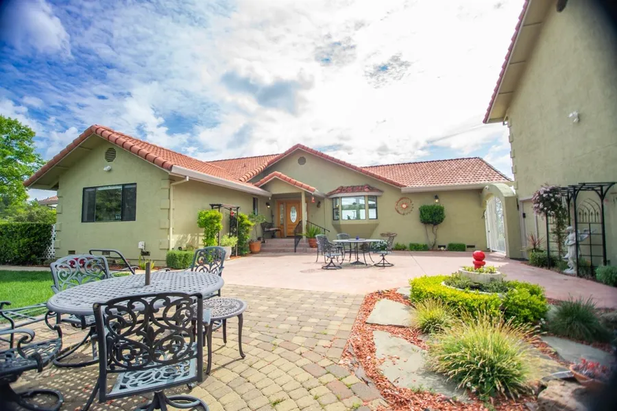 Perfectly situated just an hour from Rocklin in wine country, on its own 5 acres, this property totals 3,860 sq/ft of living space which includes 2,760 sq/ft in the main residence and 1,100 sq/ft in the secondary residence over the 4-car garage! On its own hilltop, this incredible custom home boasts million dollar views of the entire valley from the Great Room AND Master Bedroom, located just minutes to downtown Sutter Creek. The lovely one-level primary residence features a large great room with cathedral ceilings, a wet bar, & remote control custom window shades. The guest bedrooms are good-size & the master suite includes a fireplace, access to the patio, an amazing view, and custom remote control window shades. The detached, extra deep, 4 car garage has its own full bath & above the garage is an 1,100 sq/ft Casita with 1 bedroom, 1 bath, a living area, a newer deck and private entran...