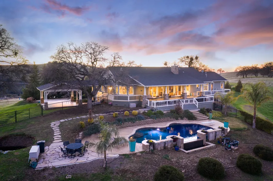 Sunsets, sunrises & panoramic views! Nestled atop 20 gorgeous acres, a gated entry leads to this quintessential country home, complete w/ wrap-around porch. Dream kitchen w/ farmhouse sink, picture window, subzero frig, Wolf 60 stove/double oven/warming drawer, drink frig & island prep sink. Formal dining room features gorgeous built-in cabinetry. Huge pantry w/ frig, shelving & cabinets offer an abundance of storage. The living room was thoughtfully designed to enjoy the stunning landscape while indoors. Double doors usher you into the master suite complete w/ mini frig/freezer, dual walk-in closets & deck access. En-suite bath w/ oversized shower, picture-perfect soaking tub & dual sinks. Two guest rooms are adjoined by Jack & Jill full bath, one ideal for an office. Covered deck overlooks sparking pool & hills beyond. Full perimeter fencing, approx. 10 acres fenced with water - ideal for animals. Carport w/covered entry to kitchen. Olive & fruit trees & so much more!