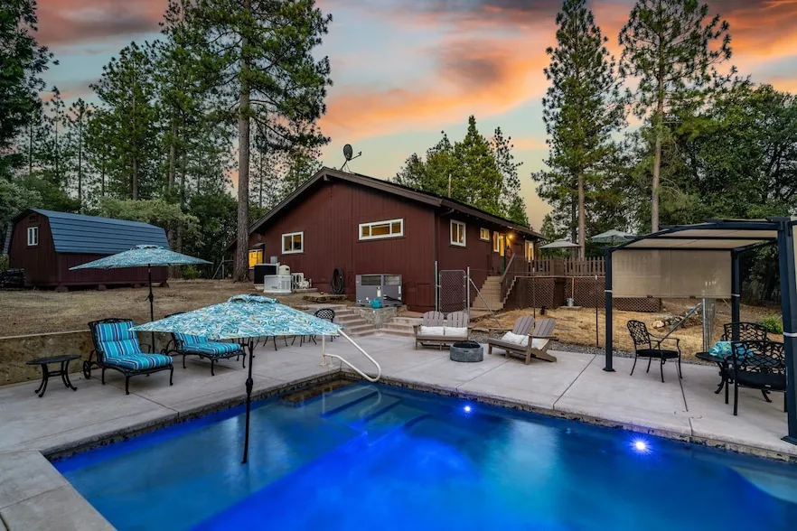Foothill gem on a level acre in Pine Grove! This beautifully updated home offers an open floor plan with beam ceilings, fireplace, laminate floors, newer HVAC, and a spacious laundry room with pantry. The renovated kitchen (2019) features stainless appliances, slide-out shelves, refinished cabinets, and updated plumbing. Energy-efficient upgrades include a whole-house 20kW Generac generator, tankless water heater, new dual pane windows, solar (2021), upgraded electrical, and USB outlets. Detached 2-car garage has finished floor and cabinetry. A guest suite/office includes ensuite bath, kitchenette, A/C, and gas fireplace. Relax outdoors in your heated in-ground pool (2022) with waterfall and oversized entertaining deck. Paved circular drive, storage shed, and ADU potential. Located at approx. 2,600' elevationabove the fog and below the snow line for ideal year-round living!