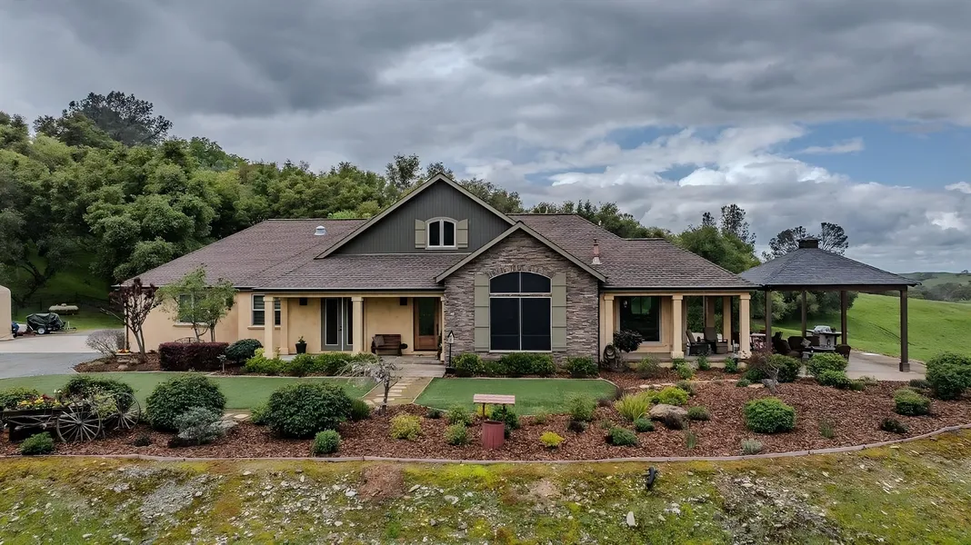 Spectacular Equestrian & Vineyard Estate - 62+ Acres in a Gated Community! This extraordinary estate blends luxury, functionality, and breathtaking views on 62+ acres. Enjoy a premier equestrian facility, a thriving vineyard, and a stunning 2,600+ sq. ft. home designed for elegance and comfort. Inside, an open great room, chef's kitchen, and formal dining area maximize space and natural light, while a charming pergola outside sets the stage for unforgettable evenings. The primary suite features incredible views, a spacious walk-in closet, and easy laundry access. A private office with a separate entrance adds convenience. Equestrian enthusiasts will love the exceptional barn with 5 European black steel stalls, a tack room, feed room, wash rack, laundry, and a studio unit with a full kitchen and bath. Ride across scenic acreage or train in the sand arena. Fenced pastures with shelters provide added comfort. The vineyard, planted with Primitivo and Syrah grapes, is leased for income. Solar panels cut energy costs, and a dedicated dog wash station ensures even pets enjoy luxury living. This one-of-a-kind estate offers unparalleled beauty, top-tier equestrian facilities, and a thriving vineyard don't miss this rare opportunity!