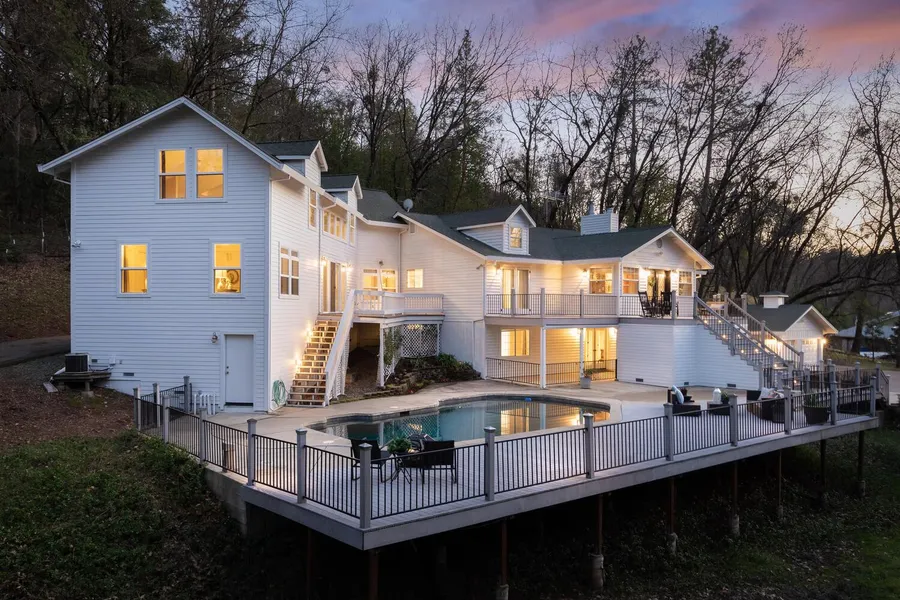 Behind the gate is a gorgeous sprawling white estate, nestled amongst magnificent oaks. The exterior was recently painted, the yard was refreshed, bedroom carpet was updated. Additionally the current ownership updated the kitchen and bathrooms. This is a turn key property. The home can be enjoyed completely, or the grand suite and main living areas can be used separately. While enjoying the sparkling pool, just steps away is a perfect space for poolside entertainment; offering a wet bar and full bathroom. The bedroom wing of the home offers a huge bonus room, laundry room with outside access. The lower level has a well appointed office with hickory built-in cabinets. The grand suite, has a private balcony, luxurious master bath and incredible walk-in closet. Separate amenities include a 3 car detached garage, a 2nd garage with carport, drive through access, property is fenced, inspections are completed, the well is strong. Come experience this beauty of this estate.