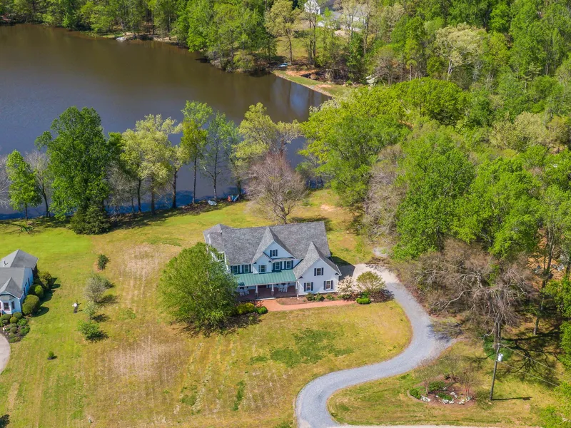 Close enough to town or work from home in this private waterfront custom home w/ 3.3 acres, 5BDs, 5BAs, 3-car garage & wraparound front porch! 15 minutes from Metro Richmond Zoo, 20 minutes from Publix! 20 mins from Downtown Blackstone! Large gourmet kitchen has custom cabinets w/granite countertops, 2 sinks, warming drawer, w/in pantry, workspace, breakfast nook, cathedral ceilings, wine fridge, Advantium cooking & near laundry room. Dining, Living and Family rooms have carpet in-lays, so your pet cant scratch the floor! Get 2 work in your Home Office w/ venetian plaster, triple crown & French doors. Escape to the shabby chic Florida Room & look at your backyard & 82-acre pond! Nestle up by the fire & admire travertine accents. Recommend taking grand interior staircase up to 2ND floor where you will find 4 perfectly-sized bds. Luxurious Master has own Reading Room/gym, Closet Factory Hi...