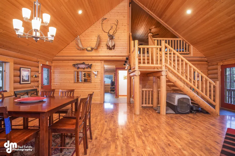 Alaska Dream Log Home, nestled in the woods! Just a few minutes from Barbara Falls, enjoy the sounds of the river from covered deck and peaceful setting with mountain and city light views.Huge main room with soaring ceilings. Kitchen has high end SXS appliances, granite counters w/upgraded cabinets and walk in pantry. Bedroom and bath one main level.'