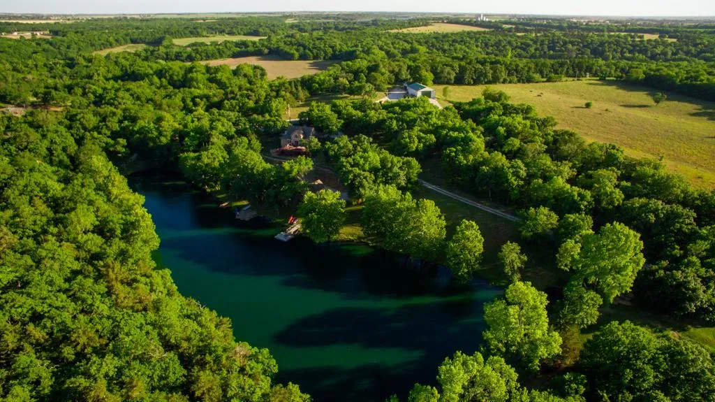 A truly unique 140 +/- acres just a few minutes west of Garnett, Kansas at the end of a dead-end road. The pristine care and detail applied to this property cant't be missed as you pull onto the property to the main lodge. The rock bluff below gives a natural flow tying into the layered stone exterior of the lodge. Follow the wrap around porch to the back of the home to a giant deck, with a 14 person hot tub and enough room for entertaining large groups comfortably. Or, simply bask there with your coffee and watch as God paints the sky every morning as you listen to turkeys fire off or plan your hunt. If the hunt is over and you feel the need to wet a line, stroll down to the lake below or hop in the buggy to the creek as both offer excellent fishing opportunities for all ages, The edges are clean and kept to reduce battling those errant casts, but odds are your arms will tired before you're done. Not to mention Cedar Creek Lake is less than 3 miles driving distance from the farm if you're looking for boating/watercraft opportunities, The list of the things to enjoy on this property are endless and can fit almost anyone's plan for fun, There are multiple tower stands in place on the farm around the crop fields. This farm has produced very good quality whitetail with minimal pressure over the years and has so much potential to produce great deer. Breakup of the agriculture fields and timber provides ample opportunity for building a great trophy farm. The spring-fed lake is crystal clear and nearly 30' deep at the dam. Sellers have two docks for swimming and fishing walking distance from the house.
