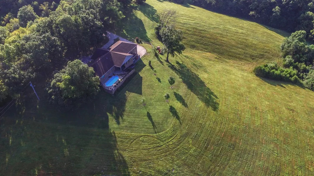 This custom brick home offers 4,100 plus sqft over an unfinished basement w/garage deep enough for 3 or 4 cars and is situated on 35 acres of the most beautiful valleys and scenic hills you could every want to call home. Along with 4/10th of a mile road frontage, located 2.8 miles from BG Parkway and 10 miles west of HWY 127, makes an easy commute for the privacy provided at this property. Some amenities include Rinnai tankless hot water heater, 2 dual fuel HVAC units and camera security system. Invite everyone over to enjoy spacious gathering kitchen, eat in the formal dining room, sing in the music room, retreat to the living room and enjoy two sided fireplace connecting awesome sunroom and splash around in the elevated inground pool! When they are gone, retreat to in your master suite complete with sitting area with fireplace and bathroom featuring 7'10x4'7 shower. Farm has good grass...