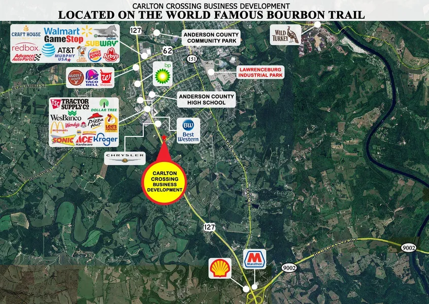 Welcome to Lawrenceburg's newest business development; Carlton Crossing! This EXCEPTIONAL CORNER LOT is located on the World Famous Bourbon Trail & talk about LOCATION, LOCATION, LOCATION! Preliminary plat offered 11 total lots, 6 have sold, & 5 currently remain so DO NOT WAIT! Only 2 corner lots still remain! BRAND NEW BEAUTIFUL FIVE STAR STATION JUST BUILT! Ideal for restaurants, retail, hotels, medical, bourbon industry, & more. Ready to go w/ turn lanes, median cut, & fully developed w/ natural gas, electric, city water/sewer, & streets. Carlton Crossing is located in the city limits & offers exceptional exposure, high rooftop counts, & stunning traffic counts! Development sits directly on TWO state highways; 4 lane US Bypass South/North HWY 127 & 2 lane state HWY Carlton Drive, plus interior roadway Legacy Way. Close to many high traffic businesses including but not limited to; Kr...