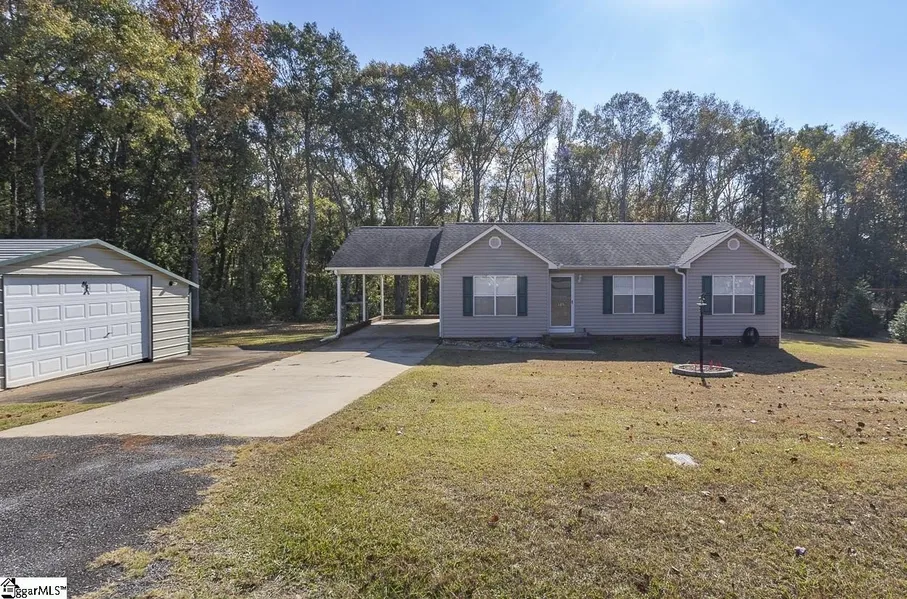 Property location qualifies for 100% USDA Rural Housing Loan financing. Single level home with no HOA nor fees and situated within a wooded and established neighborhood. Easy to maintain exerior finishes of vinyl and brick with mature landscaping. Covered parking is a combination of attached carport and detached garage. Detached building at ~600' and is finished with concrete flooring and electricity; perfect for a workshop or storage. At almost 1 acre lot the WOW is when you walk to backyard. Serene is the word with the expanse of the open grassed area, grand trees, a natural area down to the creek. Entry to the home brings you to the living room and is open to the eat in / dining area. Galley style kitchen where all appliances remain and extra storage shelved pantry. Laundry closet and side entry access door to carport complete this area. Ever popular split bedroom floorplan; with Primary featuring a walk in closet and private bathroom with newer walk in shower. Two secondary bedrooms share a hallway located full bathroom. From dining area one will access the rear covered porch; perfect for grilling and dining. Country setting property is close to south side Anderson shopping, District 3 schools and vast number of employers.