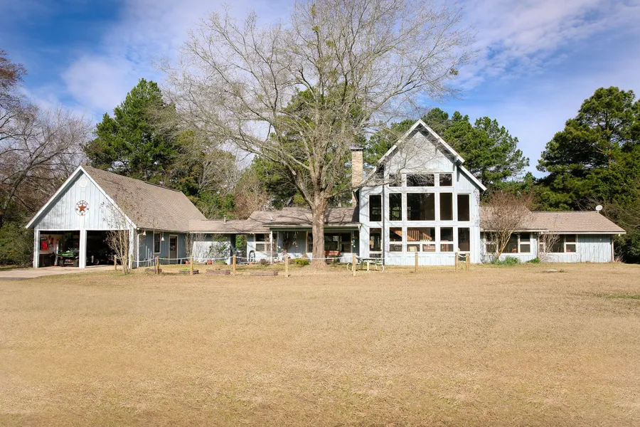 Private country oasis comprised of 39.99 acres, guest cabin & beautiful 4BD/4BA home with panoramic views of the East Texas Countryside! Floorplan consists of two living areas, one with fabulous floor to ceiling windows, upper loft & split bedroom floor plan. One bedroom is on the left at the back of the double garage and was at one time a vets' office. The expansive kitchen has two pantries, propane cooking and a fireplace in the eat-in area. Outdoor space includes a 5 car pole barn, multiple kennels used for emus and shop! The pond behind the home can be viewed from the upper walk out balcony or out on the back porch. Enjoy the peaceful serenity properties like this provide! Dont Miss