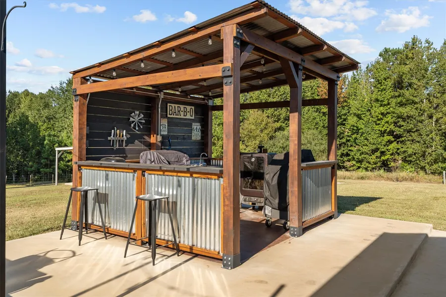 The three bedroom, two and one-half bath home features-stained concrete floors throughout, creating a seamless, low-maintenance flow. Cozy up by the wood-burning stove on cooler evenings, or step out to the covered front porch for morning views. The spacious primary suite boasts an en-suite bathroom with dual vanities, standalone tub, and a large walk-in shower. Two well-appointed guest bedrooms share a convenient Jack and Jill bath with dual vanities and a shower/tub combo. Outdoors enthusiasts will love the expansive covered patio featuring an outdoor kitchen and shower, ideal for entertaining and unwinding. The property’s agricultural appeal includes 25-acres of fenced pasture, and additional 7-acre fenced area, a shipping container equipped with a corral, head gate, and alley, plus, a versatile 30’x30’ barn/shop with a 10’x15’ wing. Inside the barn, an office with window unit provide...