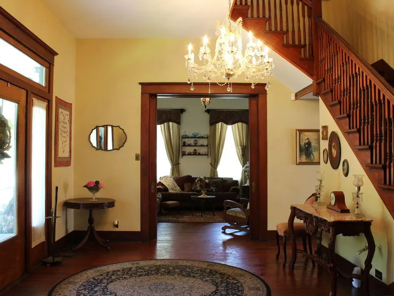 Amazing Georgian Colonial Home for sale in Historic District of Palestine, Texas! Built in the 1870's and restored over last 6 years to move-in ready condition! With 3739 sq. ft., this elegant 4 bedroom, 2 bath home has original hardwood floors, windows, doors, crown molding, open staircase, hardware, 3 coal burning fireplaces with mantels, many original fixtures, & 3 sets of working pocket doors! Bedrooms are spacious - both downstairs & upstairs! Second floor landing has French doors opening to a rebuilt covered balcony where you can enjoy the view of the other historic homes. Bonus rooms on both levels provide additional space for office/living areas. Original carriage house is 2 car garage & workshop. Majestic trees shade the fenced back yard. Many updates to the original 2x6 construction including A/C, furnace, exterior wood siding, curtains, ceiling fans/fixtures, decks, rod iron fencing, tankless water heater, sprinkler system, interior and exterior painted, foam insulation, front & back porches replaced, plumbing, electrical & much more!