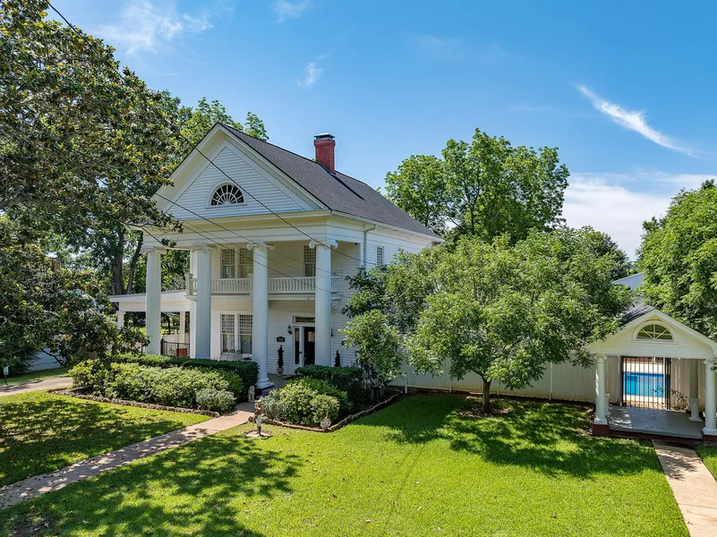 Step into timeless elegance with this stunning 1907 Greek Revival home. A grand facade greets you with stately white columns adorning the front porch, leading to an inviting entrance that exudes classic charm. Step into the spacious entry hall with stairs leading to second level. The living room, with original windows & gas fireplace with mantel, is ideal for creating warmth on chilly winter nights. The expansive dining area flows seamlessly into a newly renovated kitchen, complete with modern appliances, wine bar & bright breakfast nook overlooking a pristine saltwater pool. A downstairs bedroom & bath with a private entrance offers flexibility & comfort for guests. Ascend to the second floor to find an elegant primary suite &guest bedrooms. The primary suite was designed with luxury in mind & includes a beautifully appointed bathroom & separate closets with dressing area & laundry. Tankless water heater ensures efficiency & continuous hot water supply. Beyond the 3,024 sq. ft. main residence, an 872 sq. ft. pool house awaits, featuring comfortable living area (with hidden tv & electric F/P) &kitchenette w/tile floors, bedroom & bath. An attached two car carport adds additional covered parking & storage. The fenced & landscaped pool area provides a perfect place to relax in nature. The charming side porte cochere offers covered convenience & leads to a 3 car garage behind the home. Above the garage, discover a versatile 832 sq. ft. updated apartment featuring a well-appointed living, dining, & kitchen area w/pantry, one bedroom and one bath - perfect for guests or rental income! For those with recreational vehicles or a need for storage or a shop, a 30' x 60' RV barn w/loft is included, offering plenty of space for all your hobbies & needs. This exceptional property seamlessly blends historic charm with modern amenities, creating a truly unique & elegant living experience. Don't miss the opportunity to own this exquisite Greek Revival masterpiece.