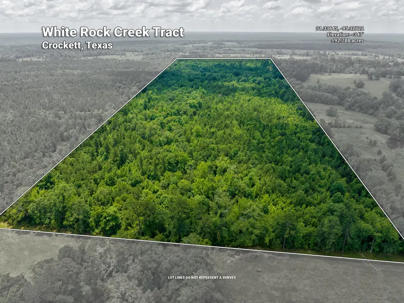 The White Rock Creek Tract has 1,200 feet of HWY 7 frontage. The tract has two big hills and the elevation on the tract ranges from 340' to 420'. The center of the tract is bisected by a 1,600' portion of White Rock Creek. The majority of the tract (approximately 75 acres) is 13 year old loblolly pine plantation. The rest of the tract is in the White Rock Creek bottom, hardwood streamside buffers, and HWY 7 aesthetic zones. The White Rock Creek bottom has a variety of mature hardwood species including white oaks, water oaks, red oaks, black walnuts, and hickories. This area has excellent hunting for deer and wild hogs.