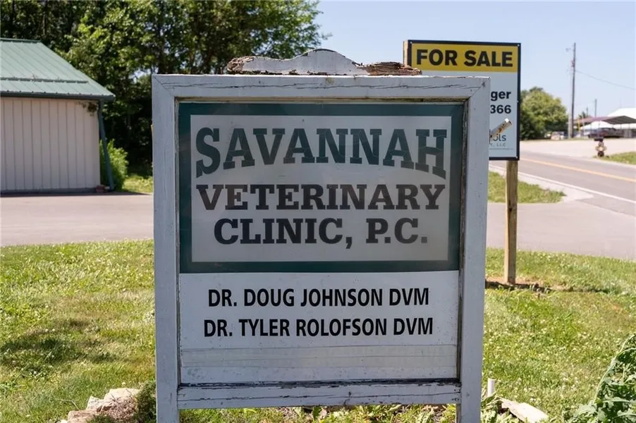Here's an opportunity to Purchase ( at appraised value) an establish large building located in a growing area of Savannah with acreage. Right on Business loop of US 71 Highway north. Lots of Square footage for any type of business (that you desire). Paved-marked parking lot for at least 13 spaces. Open and light ; reception area )Dual entry plus dual receptions with counters and office space. You can have numerous chairs in this reception area. Also, Private large office ; three smaller private office spaces; laundry room; Storage room; Break Room ; and a gathering area for staff . The opportunities for this building is endless. Added building to the south of the main building is open but covered- garage -storage- could even rent or use as an investment opportunity. Currently a very successful Veterinary business with a history of lots of traffic. Signage is also available along highway. We are looking to create a vibrant and diverse environment for our property.
