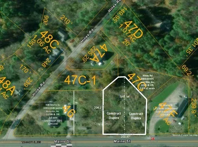 Ideal opportunity to construct two duplexes requiring a permit from the CEO. Located in the Poland Spring Bottling Company District 2 TIF. Public water and sewer are available on Maine Street. Sale includes part of Lot 47C.