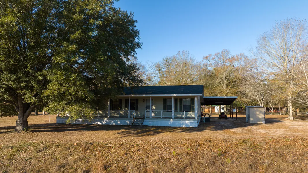 The 5+ acre yard includes a functional well house with an excellent condition well system, shed with covered garage, covered patio, and a large fenced garden ready to grow crops or be used as a livestock pen. The driveway leading to the Highway has been freshly paved by the state with additional access from County Road 377 (Guinn Rd).