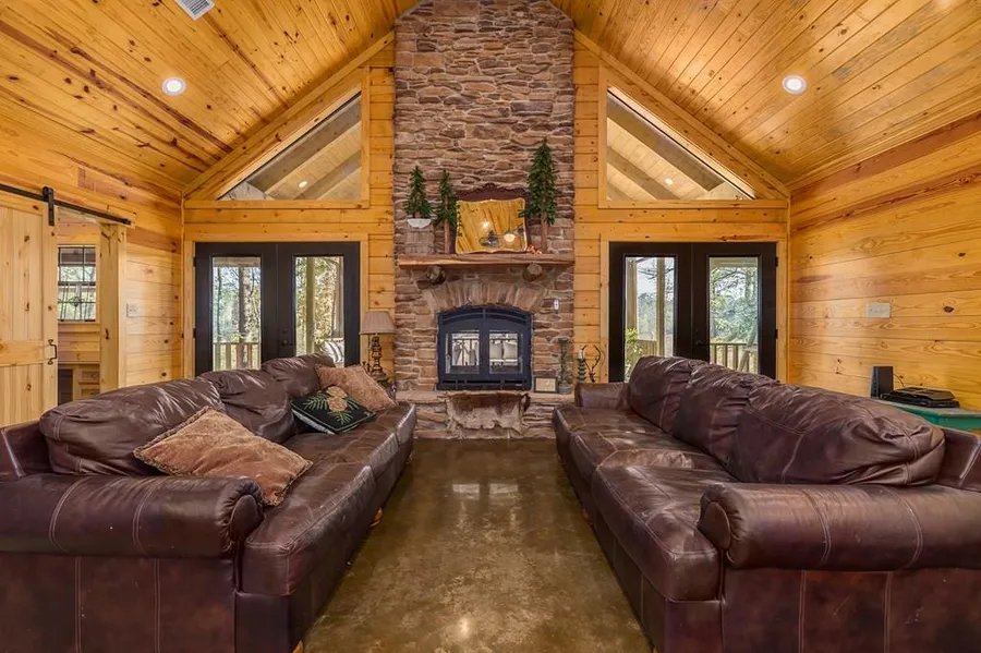 Discover a rare opportunity to own a stunning log home along the shores of Sam Rayburn Lake. This warm, inviting retreat blends rustic charm with modern comfort. A full wrap-around porch offers endless places to relax, take in the wilderness, and enjoy peaceful lake views from sunrise coffee to some of the most beautiful sunsets in the area. Inside, rich pine walls and ceilings, stained concrete floors, and a striking indoor/outdoor rock fireplace with log mantles create a timeless cabin atmosphere. The kitchen features a farmhouse sink, built-in microwave drawer, double oven, and ample workspace. The primary bathroom offers a clawfoot soaking tub and spacious walk-in steam shower for true relaxation. A pre-poured concrete pad is ready for a future garage or shop. If you’re searching for a slice of heaven on earth, you’ve found it. Don’t let low lake levels distract from the beauty and serenity here; the water will return, and so will the full magic of lakeside living.
