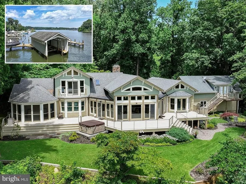 Ideally situated on the banks of Luce Creek with sweeping views down the Severn River, 1715 Porters Hill Road is a unique heritage property with over a century of history. Set on a 1.7 acre lot with 265 ft of waterfrontage, the property includes a large, hard-to-find boathouse that provides both charm and utility for all your waterfront adventures. The private pier has 7+ ft water depth and can accommodate a large vessel as well as an assortment of smaller boats. The tram makes access to the water effortless, and the entire property enjoys an exceptional privacy. Steeped in its storied past yet thoughtfully updated for modern living, this retreat captures the perfect balance of historic charm and casual elegance. The heart of the home is a sunlit great room with original log walls and quarried stone fireplace, a vaulted ceiling, and expansive windows which frame water views at every turn. An adjoining den, with separate entrance option, is a perfect place to relax. This could easily become another main level bedroom with ensuite bathroom. The kitchen is striking under its vaulted ceiling accented by exposed beams. The custom cabinetry, GE Monogram stainless steel appliances and generous island give the space so much functionality while maintaining the artisanal character. The kitchen opens to the dining area overlooking the water. The table is anchored by a craftsman-style light fixture, and the entire first and second floors have beautiful wood floors. Step outside and you're embraced by nature: multiple porches and decks overlook lush, manicured grounds that lead down to the water's edge. The main-level primary suite is a true sanctuary, designed for privacy and tranquility. The bedroom, with a vaulted ceiling, has a screened porch overlooking the water. Two expansive walk-in closets offer custom organization systems that would make a clothing connoisseur smile. The spa-like bathroom gets lots of natural light from the windows that frame the water, and the freestanding soaking tub is situated to enjoy this view. A dual-sink vanity, heated floors, generous walk-in shower with a built-in bench, and a spacious cosmetic area with dedicated seating make getting ready feel effortless and luxurious. A dedicated laundry area just off the hallway makes day-to-day living very easy. Part of the primary suite is a gracious office with gas fireplace and outdoor access. This is a totally flexible space: install a wall of bookshelves and you'd have a lovely library. Upstairs, there are two generously sized bedrooms. One has water views and a waterside balcony; the other overlooks the lush landscaping out front. There is a hall bathroom. A separate guest bedroom suite above the garage, complete with its own living area and luxe bathroom, is ideal for visiting friends and family who desire more privacy. The Historical Context: Originally built in the 1880s, this log house was one of three identical structures used as hunting lodges. It is the only one that remains. The construction of the log house is one of great craftmanship, including sizing each log to be approximately the same diameter as others. Lore has it that around the turn of the 20th century, the Naval academy wanted to acquire more land by the academy and traded this peninsula for land across from College Creek. The Naval Academy superintendent, Admiral David Porter, could be where the name Porter's Hill derived from. In the 1920's, the Whitehead family - three brothers known for running bootleg liquor to Baltimore and Washington during Prohibition - used the property as a place to entertain and stop on the way to Baltimore. In the 1940s, the brothers' exploits caught up with them, and the State of Maryland confiscated the Porters Hill peninsula. Through a unique trade involving the Jones family's gravel pit (now the site of the 895 Tunnel), this private waterfront enclave found its next chapter.