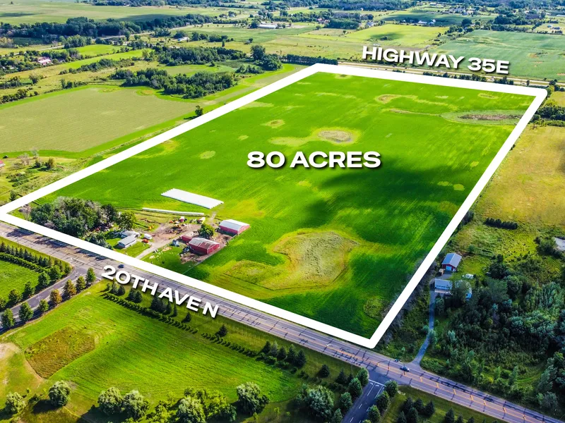 80 acres of prime mixed-use land featuring a single-family residence and two 40x64 pole barns. Over 1,300 feet of frontage along Interstate 35E, this high-visibility location sits directly across from the new Eagle Brook Church campus. Bordering the 360-acre Lino Lakes comprehensive plan area, the property offers compelling future development potential. Approximately 70 acres are currently leased under a one-year agreement generating $7,500 annually. Strategically located near all major thoroughfares, ensuring ease of access and long-term value. Potential opportunities for billboard income or highly visible business signage. See supplement for detailed Lino Lakes zoning information.