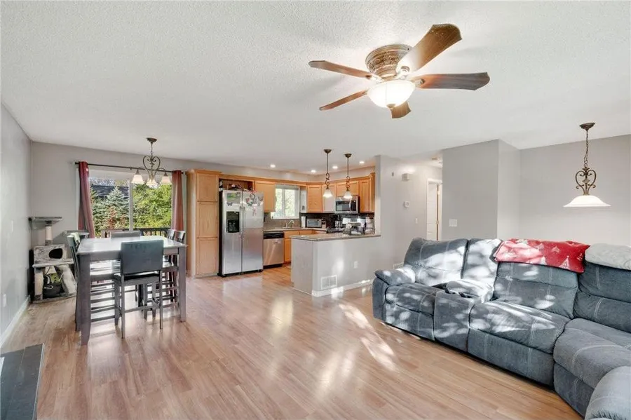 Welcome to this inviting 4BR, 2BA split entry home in a quiet Centerville neighborhood! The open-concept main level features a bright living room that flows into the dining area and kitchen, complete with stainless steel appliances, a gas stove, and a peninsula perfect for entertaining or family meals. 2 nice sized bedrooms and a full bath conveniently just down the hall from the main level living space. Step outside to a spacious 13x13 deck overlooking the fully fenced backyard with nearly half an acre of yard space to relax, garden, or play. The lower level adds even more living space with a family room, two additional bedrooms, a ¾ bath, and laundry area. Enjoy a roomy 2-stall detached garage with a great garden space behind it. Recently updated roof shingles (approx. 6 years old), giving you peace of mind. Conveniently located near I-35 for easy commuting, yet tucked away in a quiet neighborhood close to parks, trails, and lakes. Move-in ready, well cared for, and full of charm. Come see why this could be your next home!