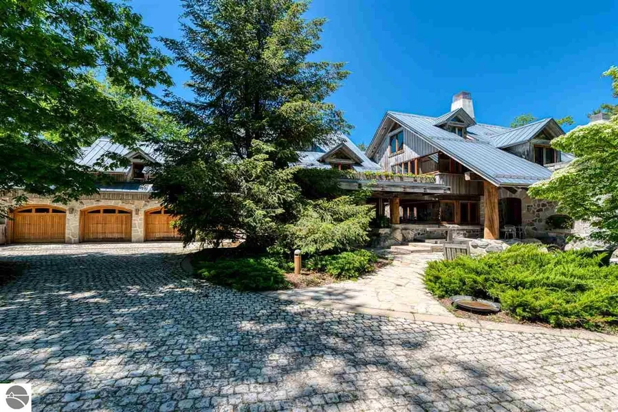 This fantastic northern Michigan waterfront estate is an outdoor enthusiasts dream retreat: bike ride or walk into the village of Elk Rapids, hike or walk the beach, sail, kayak, swim, fish or drive a short distance to one of the world-class trout streams to enjoy fly fishing or canoeing, cross-country ski, snowshoe, hunt mushrooms or enjoy one of the local ski resorts. This very special estate is located on 600' of East Grand Traverse Bay, is 7 acres and features a main residence, meeting barn, orchard garden & tennis court. The 15,000 square foot main residence is an architectural masterpiece designed by Roger Hummel with local stone & timber (local granite, limestone, white oak timbers, teak windows and doors). With twenty-seven rooms and eleven bedrooms, the main house can host parties of several hundred people & has overnight accommodations for more than thirty people. Other highlig...