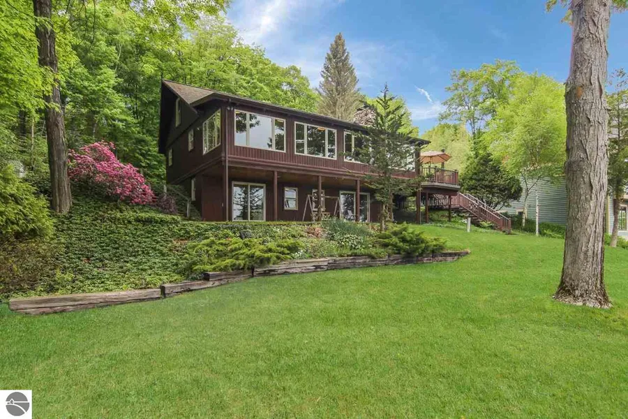 Stunning fully updated Bellaire Log home for the perfect combination of upnorth and lake living. Tucked into a very quiet location on a dead end street. Home has been fully remodeled with beautiful wood floors throughout, custom kitchen with gorgeous cabinets, expansive granite counter tops with stainless steel appliances. Great room design has open floor plan for kitchen, dining and living rooms. Living room has a stone wood burning fireplace from floor to second floor ceiling. Main floor master is very spacious, has room for a sitting area, double closets and lovely lake views. Charming bonus space is the year round porch that runs the entire lake side of the home, stunning lake & naturally landscaped yard views. Upstairs is an additional bedroom plus a cozy loft, currently used as office space. Walk out lower level has a family room with additional fireplace, second master bedroom wit...