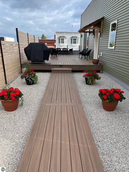 Welcome to your bright and inviting two-bedroom, two-bathroom upper level unit, perfectly situated in the thriving Elk Rapids Village business district. This property comfortably sleeps up to six and features a desirable primary suite for added privacy. Imagine relaxing or entertaining on the large composite deck while enjoying picturesque Lake Michigan vistas. This unit boasts both resilience and aesthetic appeal thanks to features like sleek surface countertops, stainless steel appliances, discreet recessed ductless heating and cooling, and long-lasting flooring. Enjoy the ease of private parking and the versatility of this unit, perfect for either long-term living or short-term rentals. This exceptional property offers an ideal blend of comfort, convenience, and investment. Sale is subject to tenant rights and Seller completing tax split between upper and lower unit.