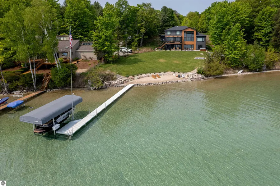 An exquisite Torch Lake waterfront residence with 125 feet of private frontage. Showcasing contemporary elegance, sleek architecture, and premium craftsmanship along Torch Lake's shoreline, the living space features a dramatic fireplace, floor-to-ceiling windows offering panoramic views, elevated ceilings, and distinctive design elements. The gourmet kitchen boasts a striking quartz island with counter seating; premium stainless steel appliances; designer tile backsplash; and extensive storage options. Start each day with lakefront vistas from the serene master retreat featuring an oversized Alaskan King bed, integrated fireplace, refined architectural elements, spa-like bathroom, and spacious walk-in closet. The upper level reveals an expansive entertainment/family space, three well-appointed bedrooms, and a complete bathroom. The lower level presents a spacious secondary living area with a family room, sophisticated wet bar equipped with spirit dispensers & drink cooler, and large sliding doors accessing the patio and private waterfront. Two lakeside bedrooms, a full bathroom, and utility room complete this level. Multiple outdoor entertainment venues include a composite deck featuring a shade structure and modern railings, an extensive patio incorporating a custom fire pit and spa, and sprawling grounds. Enjoy the private sandy beach area for sunbathing and swimming before boating the renowned Chain-of-Lakes waterways. A dedicated helipad allows guests grand arrival options. The home is being sold furnished with additional features encompassing 4,100+sq/ft, main level study/den, main floor laundry, six total bedrooms, 3.5 bathrooms, contemporary lighting fixtures, signature architectural details, built-in cabinetry, climate control, professional landscaping, and three-car temperature-controlled garage. Create your family's legacy retreat and welcome loved ones to forge lasting memories. Click on virtual tour link for an incredibly realistic view of the interior